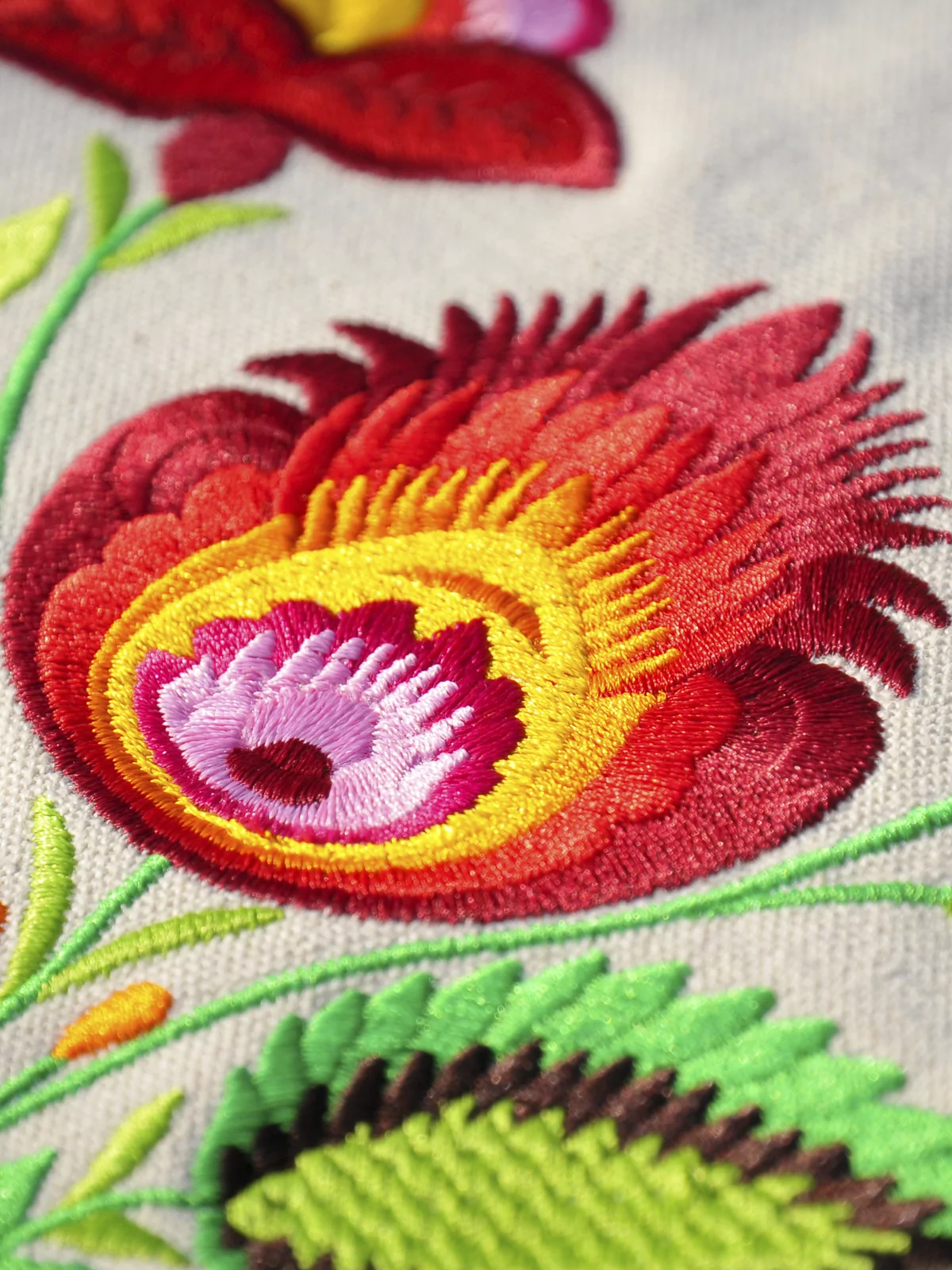 Regionalny haft komputerowy pochodzenia Łowickiego na białym materiale